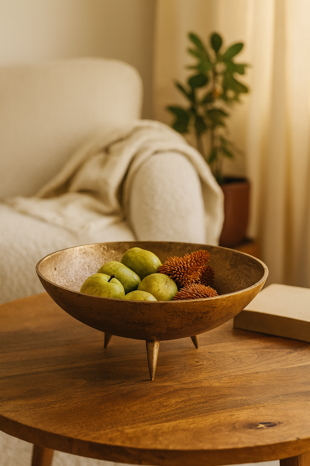 A vessel of timeless ritual. The Delphi Bowl takes inspiration from the tripod cauldrons of Ancient Greece, objects of offering and ceremony that stood at the heart of communal gatherings. Hand-finished with a hammered texture, the bowl glows with an aged golden patina, showcasing archaic and modern at the same time. Whether used aas a centerpiece, fruit bowl, or sculptural accent, the Delphi Bowl carries the aura of it’s history into the contemporary home.